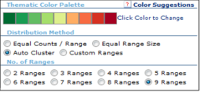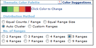 The number of ranges determines the number of thematic colors to use on the map. The colors used from the Map Color Palette will adjust according number of ranges selected. It will always use the first and last colors and adjust the remaining to best represent your palette.